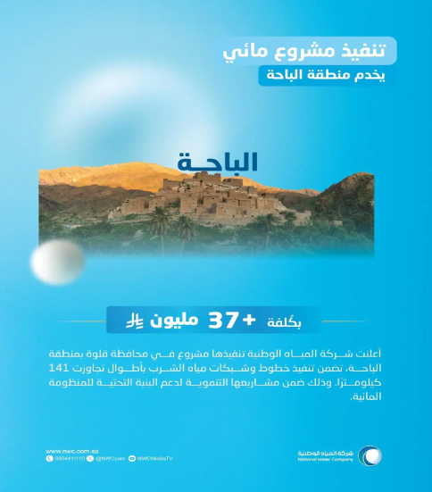 وأوضحت الشركة أن تنفيذ هذا المشروع يأتي ضمن الجداول الزمنية المعتمدة، وتماشيًا مع الطلب المتزايد على المياه، مع التأكيد على التزام الشركة بتطبيق أعلى معايير الجودة في تنفيذ مشاريعها، وتضمن المشروع استكمال تنفيذ خطوط ناقلة وشبكات مياه بطول (141,870) مترًا طوليًا في محافظة قلوة بمنطقة الباحة، إضافة إلى إنشاء محطة ضخ بسعة إجمالية تتجاوز (8.4) آلاف متر مكعب يوميًا؛ وذلك بهدف رفع نسبة التغطية، وإيصال المياه إلى أكبر عدد من السكان في المحافظة والقرى التابعة لها، بكُلفة إجمالية تجاوزت (37) مليون ريال لخدمة أكثر من (10) آلاف مستفيد.
