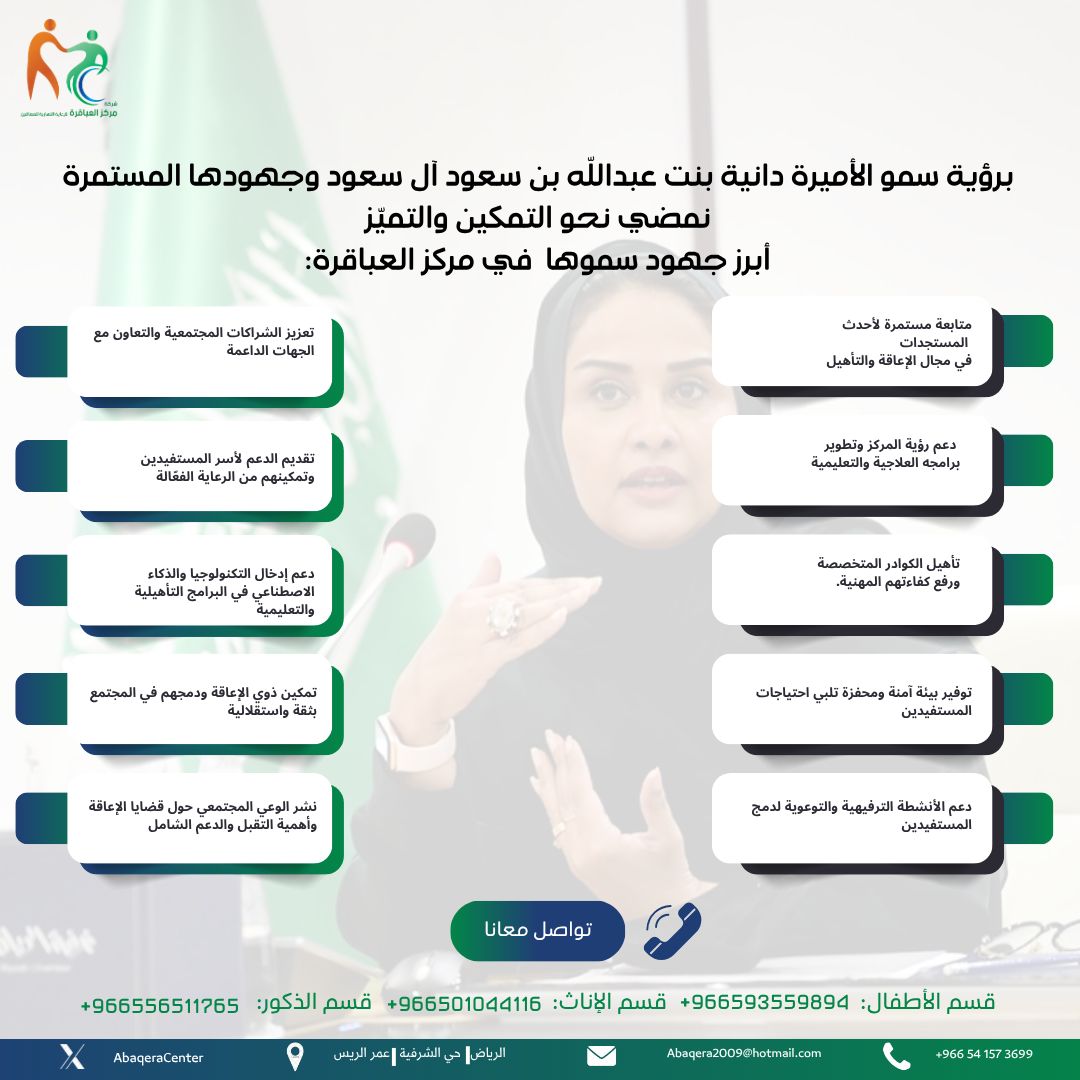 علما بأن التسجيل للسعوديين سيكون مجاني و ذلك من خلال البوابة الإلكترونية لوزارة الموارد البشرية و التنمية الاجتماعية من خلال الرابطهذا و برؤية سمو الأميرة دانية بنت عبد الله بن سعود آل سعود و جهودها المستمرة للمضي نحو التمكين و التميز و التي من أبرز جهودها في مركز العباقرة المتايعة المستمرة لأحدث المستجدات في مجال الرعاية و التأهيل ، دعم رؤية المركز و تطوير برامجه العلاجية و التعليمية ، و تأهيل الكوادر المتخصصة و رفع كفاءتهم المهنية و توفير بيئة آمنة و محفزة تلبي احتياجات المستفيدين و دعم الأنشطة الترفيهية و التوعوية لدمجهم و تعزيز الشراكات المجتمعية و التعاون مع الجهات الداعمة و تقديم الدعم لأسر المستفيدين و تمكينهم من الرعاية الفعالة .