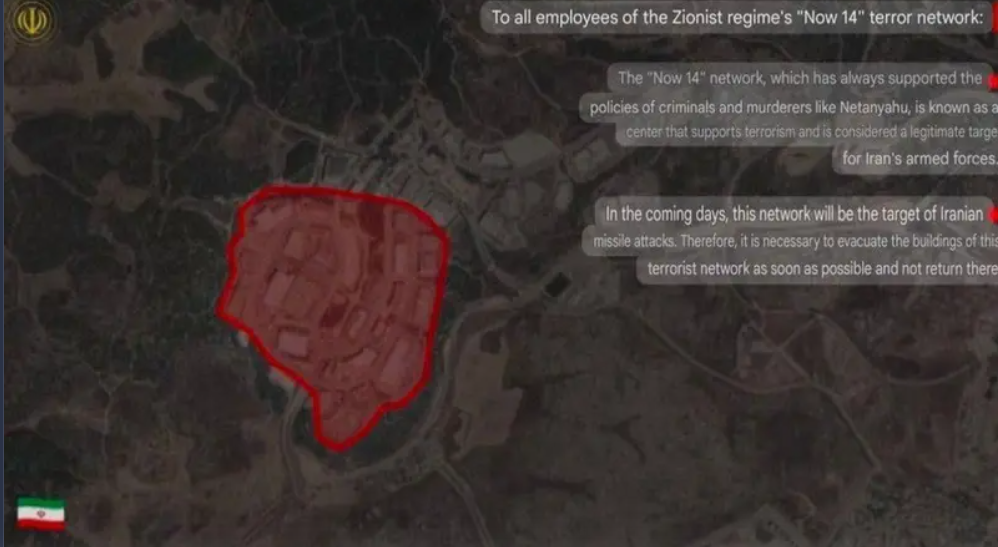 و وجهت القوات المسلحة الايرانية تحذيرا باخلاء مبنى القناة 14 العبرية على الفور لانها ستكون هدفا مشروعا خلال الايام القادمة.