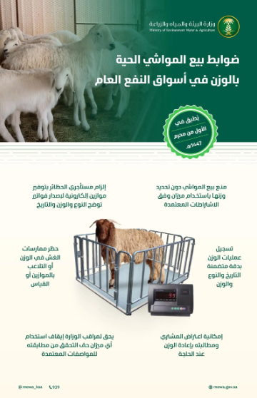 وحددت الوزارة عددًا من الضوابط لبيع المواشي بالوزن؛ بهدف ضمان تطبيق المعايير التي تكفل تداولها وبيعها للمستهلكين، وتحقيق أقصى فائدة مرجوة من هذا الإجراء؛ بما ينعكس إيجابًا على قطاع الثروة الحيوانية في المملكة، إضافةً إلى تعزيز قيم العدالة والشفافية في بيع وشراء المواشي، وتحسين جودة واستدامة الخدمات المقدمة في أسواق النفع العام.
