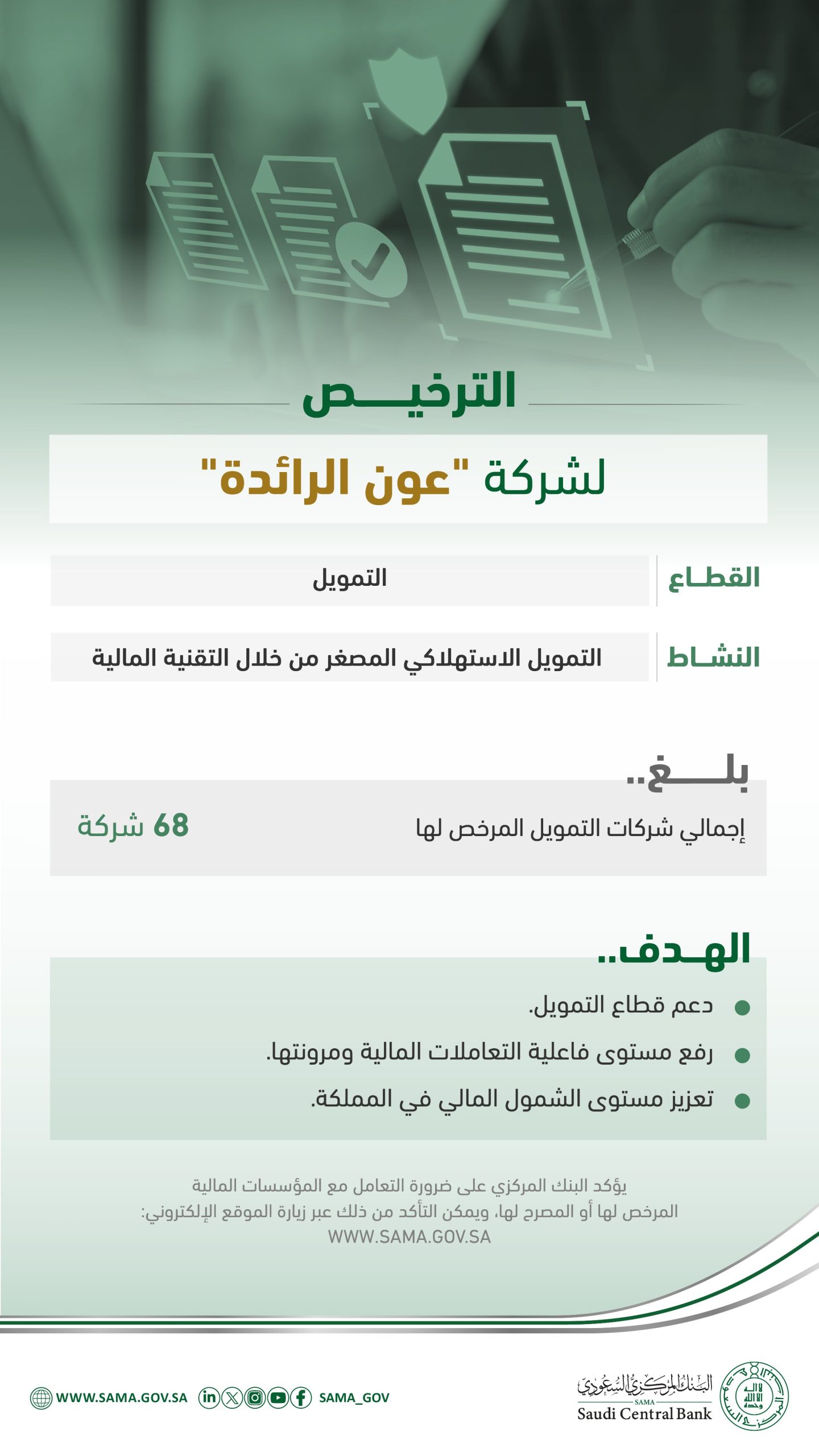 البنك المركزي السعودي يرخص لشركة “عون الرائدة” لمزاولة نشاط التمويل الاستهلاكي المصغر من خلال التقنية المالية