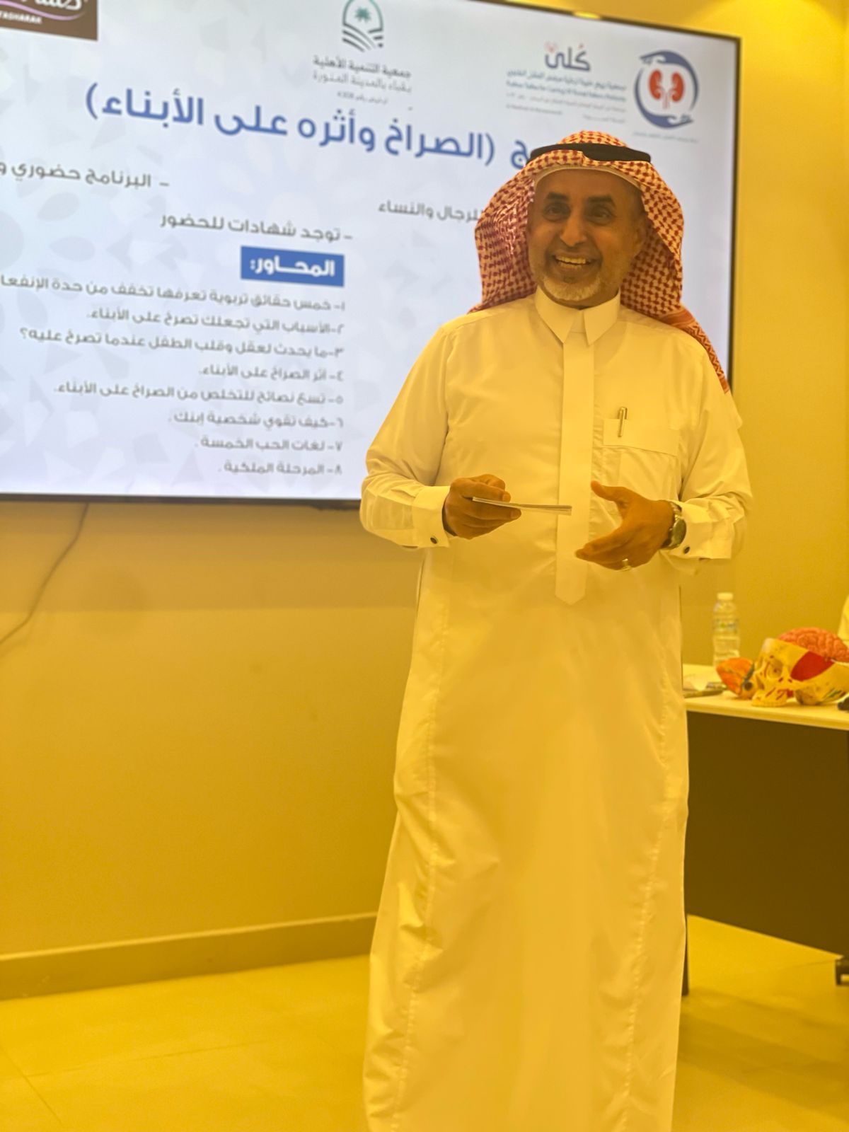نُظّم هذا اللقاء التوعوي الهادف تحت عنوان “الصراخ وأثره على الأبناء”، ضمن سعي جمعية “كُلى” إلى رفع الوعي التربوي لدى أولياء الأمور والمعلمين والمعنيين بشؤون التربية. وقد أدار اللقاء باقتدار د. فهد بن حامد الحازمي، الخبير في الشؤون الأسرية والتربوية، والذي قدم عرضًا ثريًا حول أثر الصراخ في تكوين شخصية الطفل وصحته النفسية، وسبل الوقاية والعلاج.
