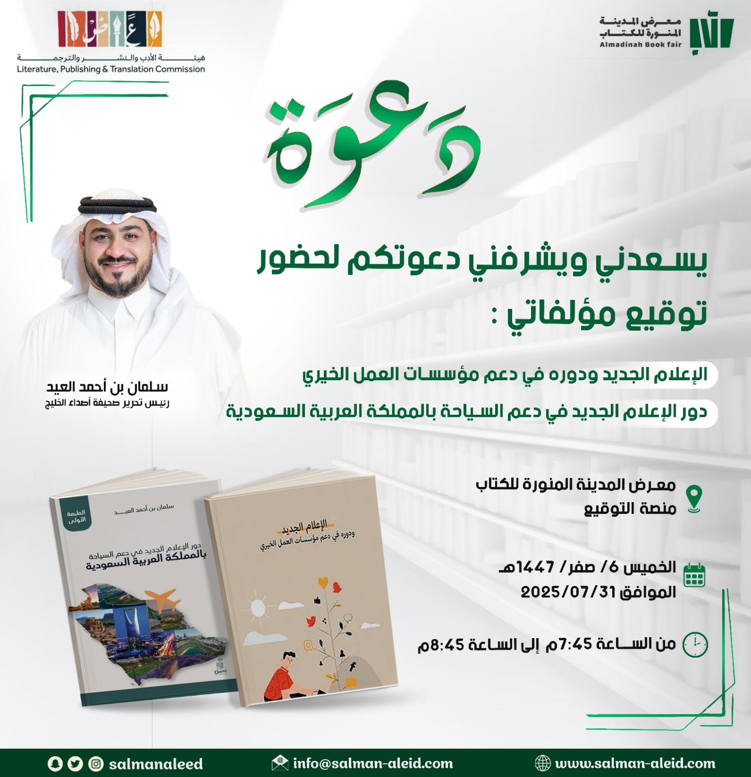 كما دعا “العيد” لحضور وتشريف حفل توقيع لكتابيه الجديدين بعنوان ” الإعلام الجديد ودوره في دعم مؤسسات العمل الخيري – دور الإعلام الجديد في دعم السياحة بالمملكة العربية السعودية”، وذلك يوم الخميس 6 صفر 1447هـ، من الساعة الثامنة إلا ربع مساءً وحتى التاسعة إلا ربع مساءً، في منصة التوقيع بمعرض المدينة المنورة للكتاب.