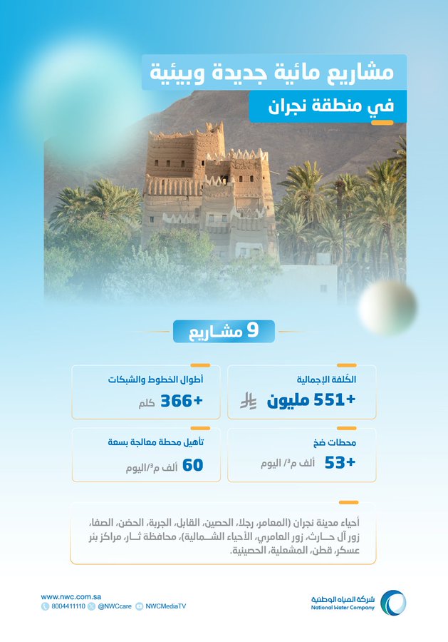 وبيَّنت أن مشروعات المياه التي بدأت في تنفيذها بلغت (7) مشروعات في منطقة نجران، ستغطي عددًا من أحياء مدينة نجران، إضافة إلى عددٍ من المحافظات تشمل: محافظة ثار، ومراكز بئر عسكر، وقطن، والمشعلية، والحصينية، حيث سيتم تنفيذ خطوط ناقلة وشبكات بأطوال تتجاوز (357) كيلومترًا طوليًا، إضافة إلى تنفيذ محطات ضخ بطاقة تصميمة إجمالية تتجاوز (53) ألف مترٍ مكعب يوميًا.