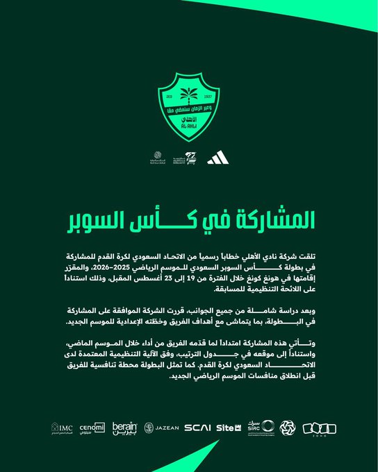 الأهلي يعلن مشاركته رسميًا في كأس السوبر السعودي بعد اعتذار الهلال