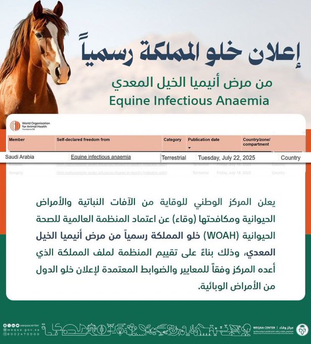 أعلنت المنظمة العالمية للصحة الحيوانية (WOAH) رسميًا خلو المملكة العربية السعودية من مرض أنيميا الخيل المعدي. جاء هذا الإعلان بناءً على التقييم الفني الذي أجرته المنظمة لملف المملكة، والذي أعده المركز الوطني للوقاية من الآفات النباتية والأمراض الحيوانية ومكافحتها “وقاء”. يتوافق هذا الملف مع الاشتراطات والمعايير الدولية المعتمدة لإعلان خلو الدول من الأمراض الحيوانية الوبائية.