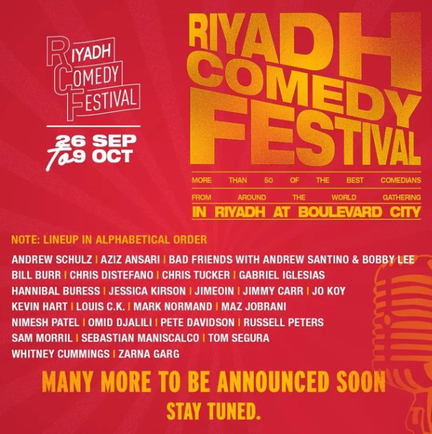 ويُعد هذا المهرجان الأضخم عالمياً في مجال الكوميديا، ويجمع أكثر من 50 من ألمع نجوم الكوميديا من مختلف أنحاء العالم لتقديم عروض استثنائية تضيف إلى رصيد الرياض كواحدة من أهم الوجهات للترفيه العالمي.