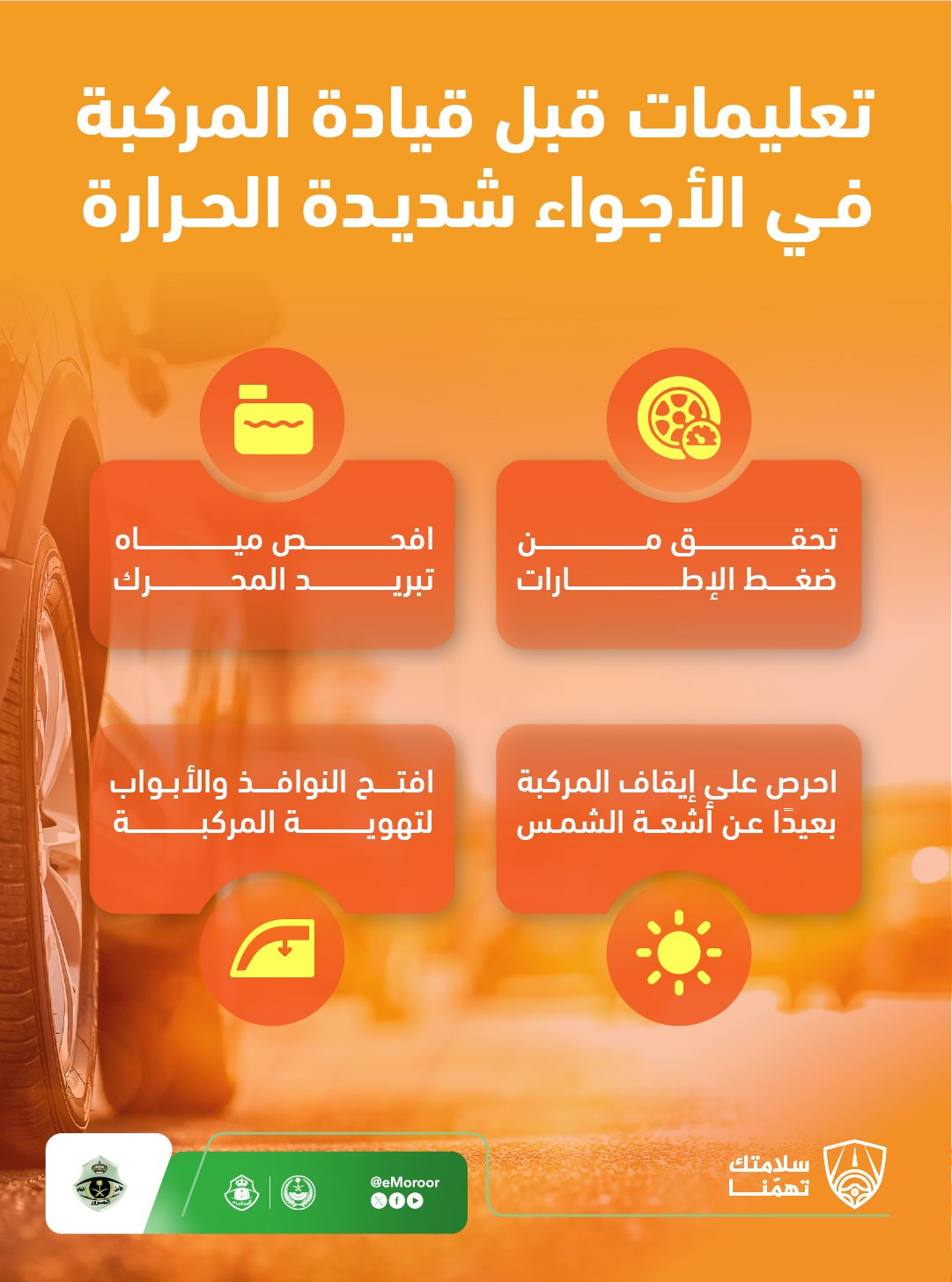 وأضافت عبر انفوجرافيك على منصة (إكس)، أن قائد المركبة عليه التحقق من ضغط الإطارات، وفحص مياه تبريد المحرك.