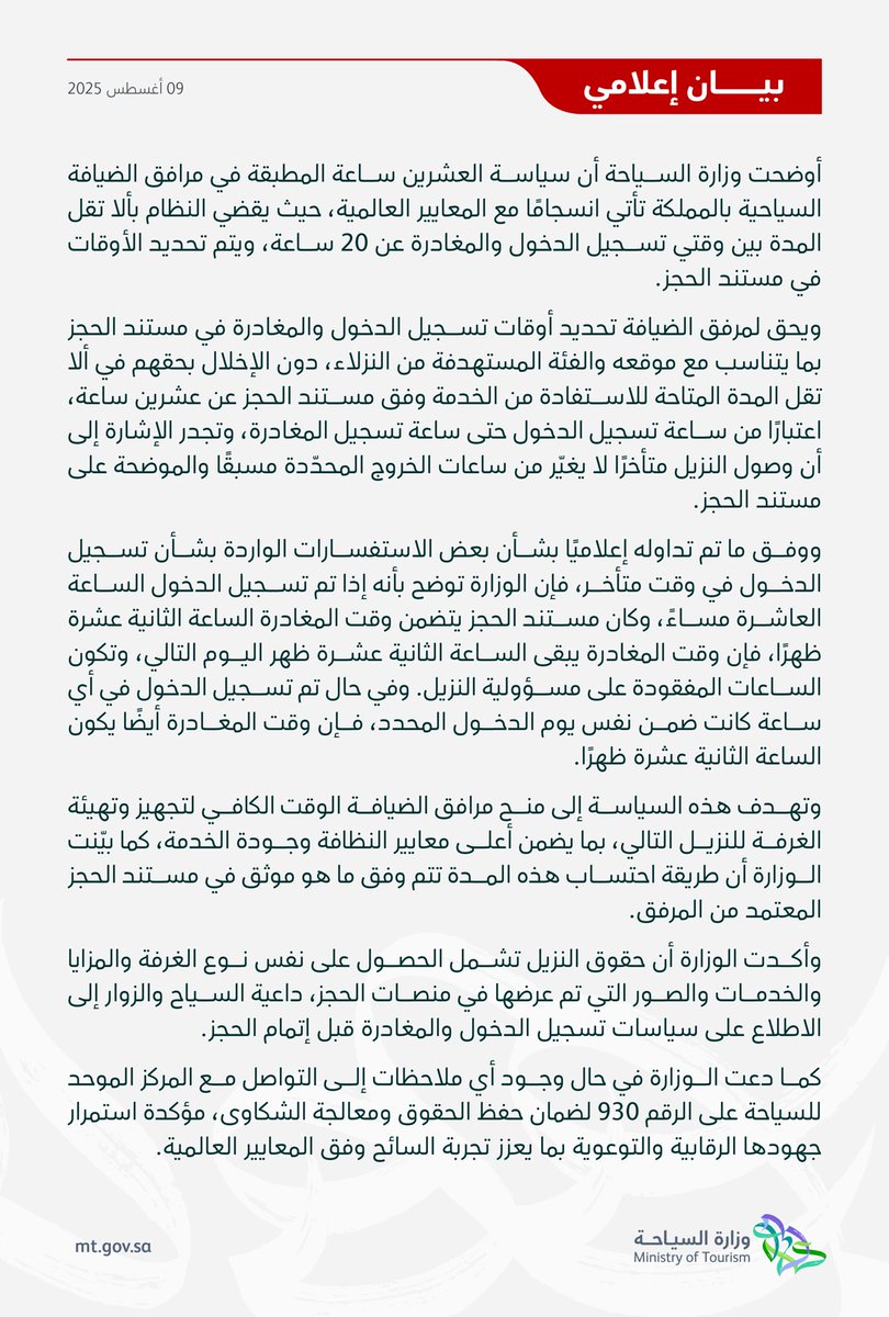 ووفق ما تم تداوله إعلاميًا بشأن بعض الاستفسارات الواردة بشأن تسجيل الدخول في وقت متأخر، فإن الوزارة توضح بأنه إذا تم تسجيل الدخول الساعة العاشرة مساءً، وكان مستند الحجز يتضمن وقت المغادرة الساعة الثانية عشرة ظهرًا، فإن وقت المغادرة يبقى الساعة الثانية عشرة ظهر اليوم التالي، وتكون الساعات المفقودة على مسؤولية النزيل، وفي حال جرى تسجيل الدخول في أي ساعة كانت ضمن نفس يوم الدخول المحدد، فإن وقت المغادرة أيضًا يكون الساعة الثانية عشرة ظهرًا.
