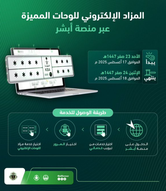 وأشارت «المرور»، عبر صفحتها على منصة «إكس»، إلى أن «المزاد يتم طرحه عبر منصة أبشر، التي تمكّن الراغبين في شراء اللوحات المميزة من المشاركة في المزاد إلكترونيًا».