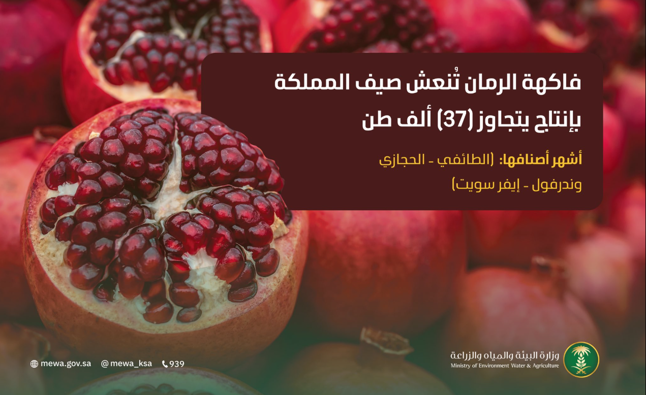 وأكدت وزارة البيئة والمياه والزراعة، أن الرمان المحلي يُعد من المحاصيل الواعدة الذي تتركز زراعته في مناطق، عسير، ومكة المكرمة، تبوك، القصيم، الباحة، بجانب إنتاجه في باقي المناطق بكميات متفاوتة، كما يشتهر الرمان بتنوع وتعدد أصنافه، ومن أبرزها، الطائفي، الحجازي، وندرفول، وايفر سويت، مما يدعم الاستهلاك الطازج والصناعات التحويلية، مثل العصائر، والمثلجات والحلوى.