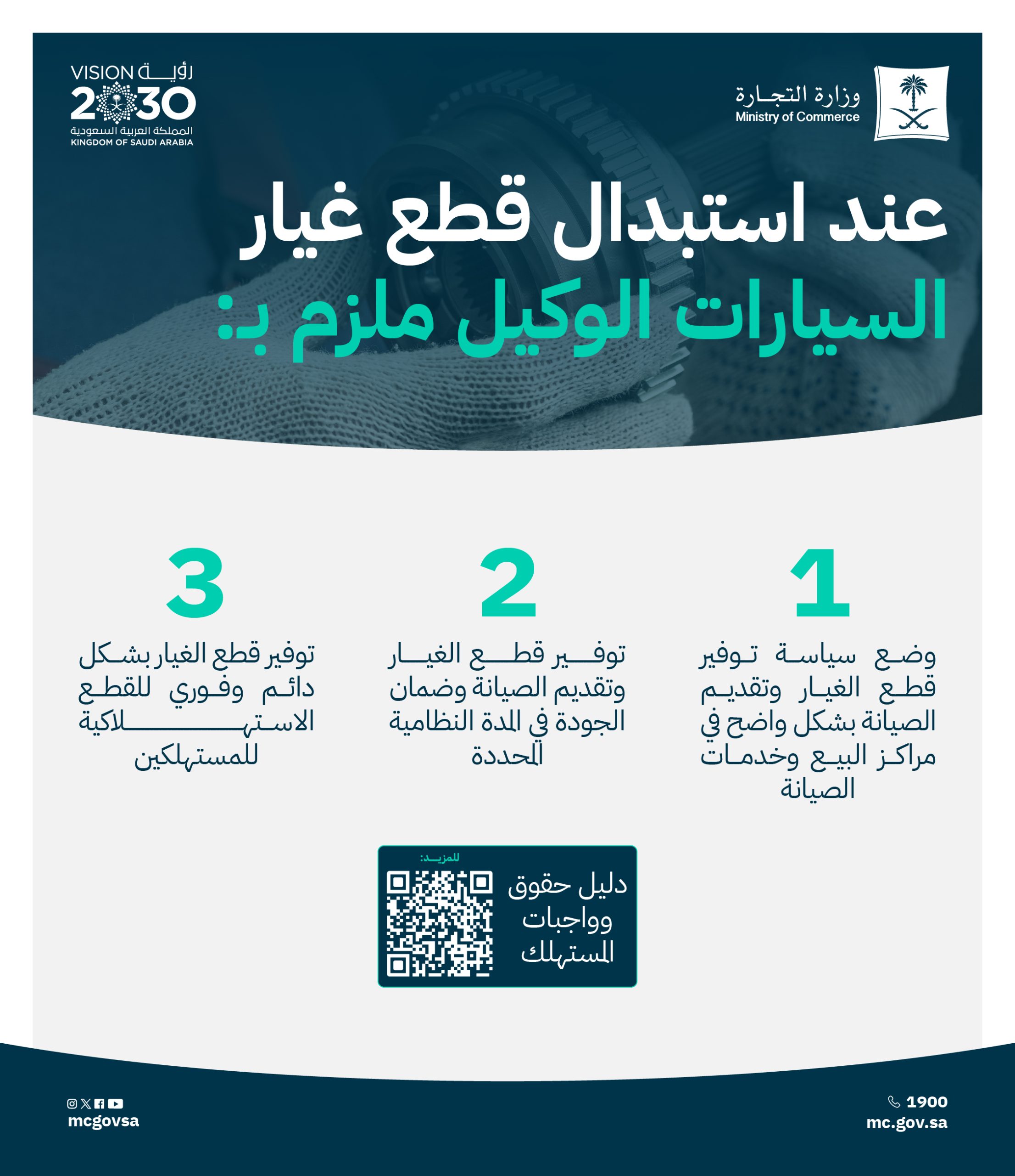 وأوضحت وزارة التجارة، عبر منصة إكس، أنه عند استبدال قطع غيار السيارات الوكيل ملزم بوضع سياسة توفير قطع الغيار وتقديم الصيانة بشكل واضح في مراكز البيع وخدمات الصيانة.