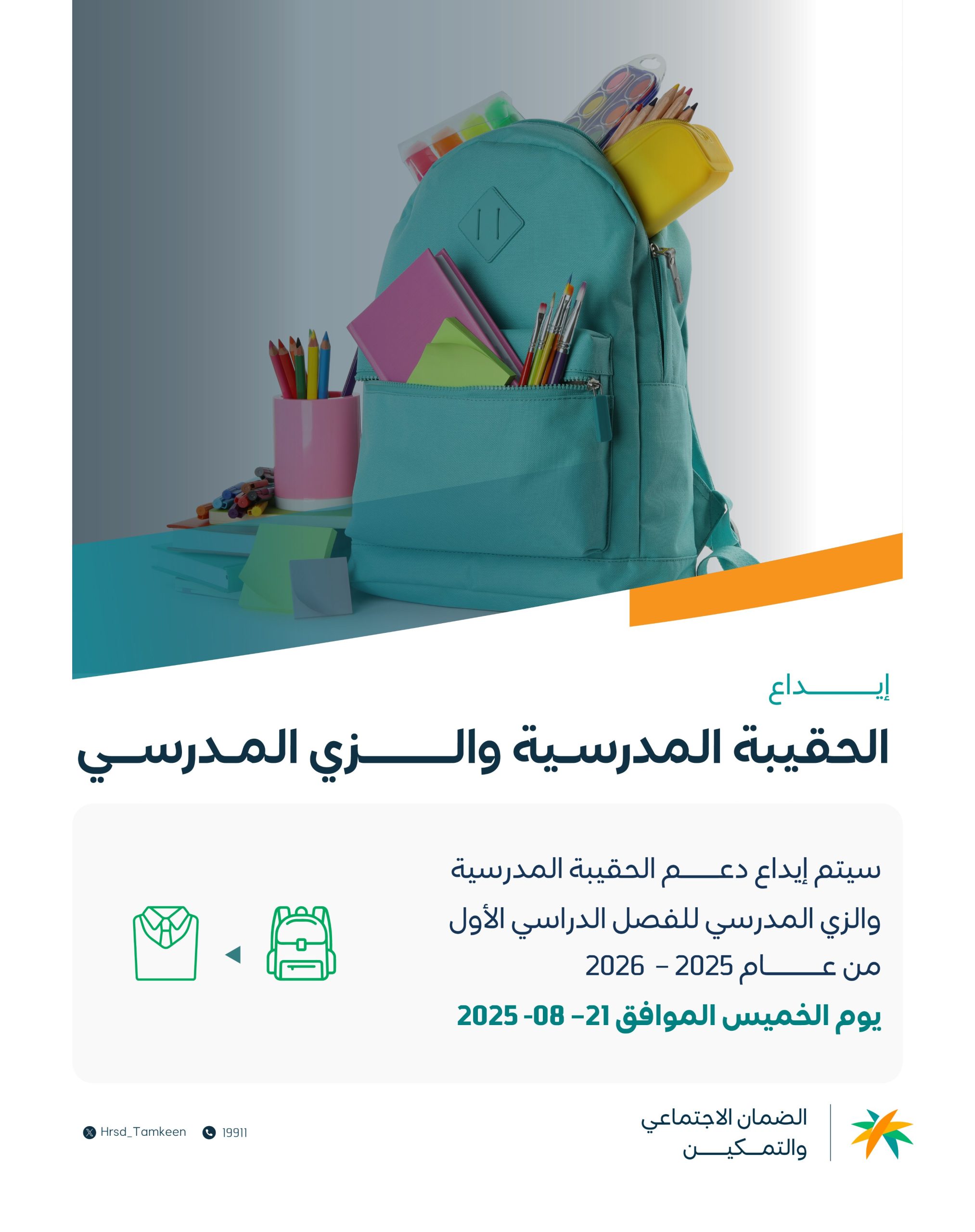 أكد نظام الضمان والتمكين، إيداع دعم الحقيبة المدرسية والزي المدرسي للفصل الدراسي الأول من عام 2025، 2026 غدا الخميس.