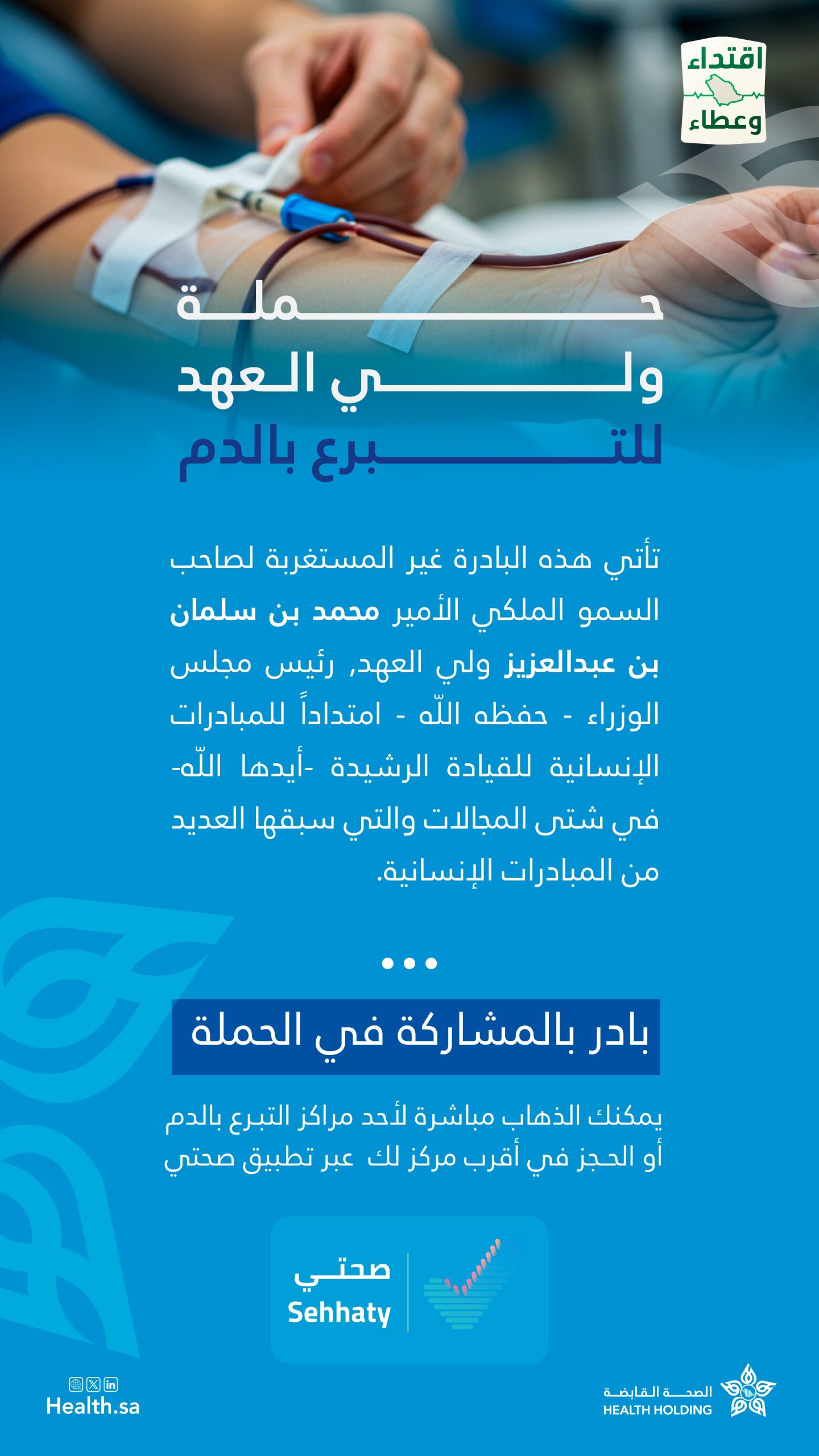 استلهامًا من مبادرة سمو ولي العهد – حفظه الله – في التبرع بالدم، لتجسّد أسمى معاني المسؤولية وتعزيز ثقافة العطاء ، بدأت الصحة القابضة والتجمعات الصحية في مختلف مناطق المملكة استقبال المواطنين والمقيمين الراغبين في التبرع بالدم.