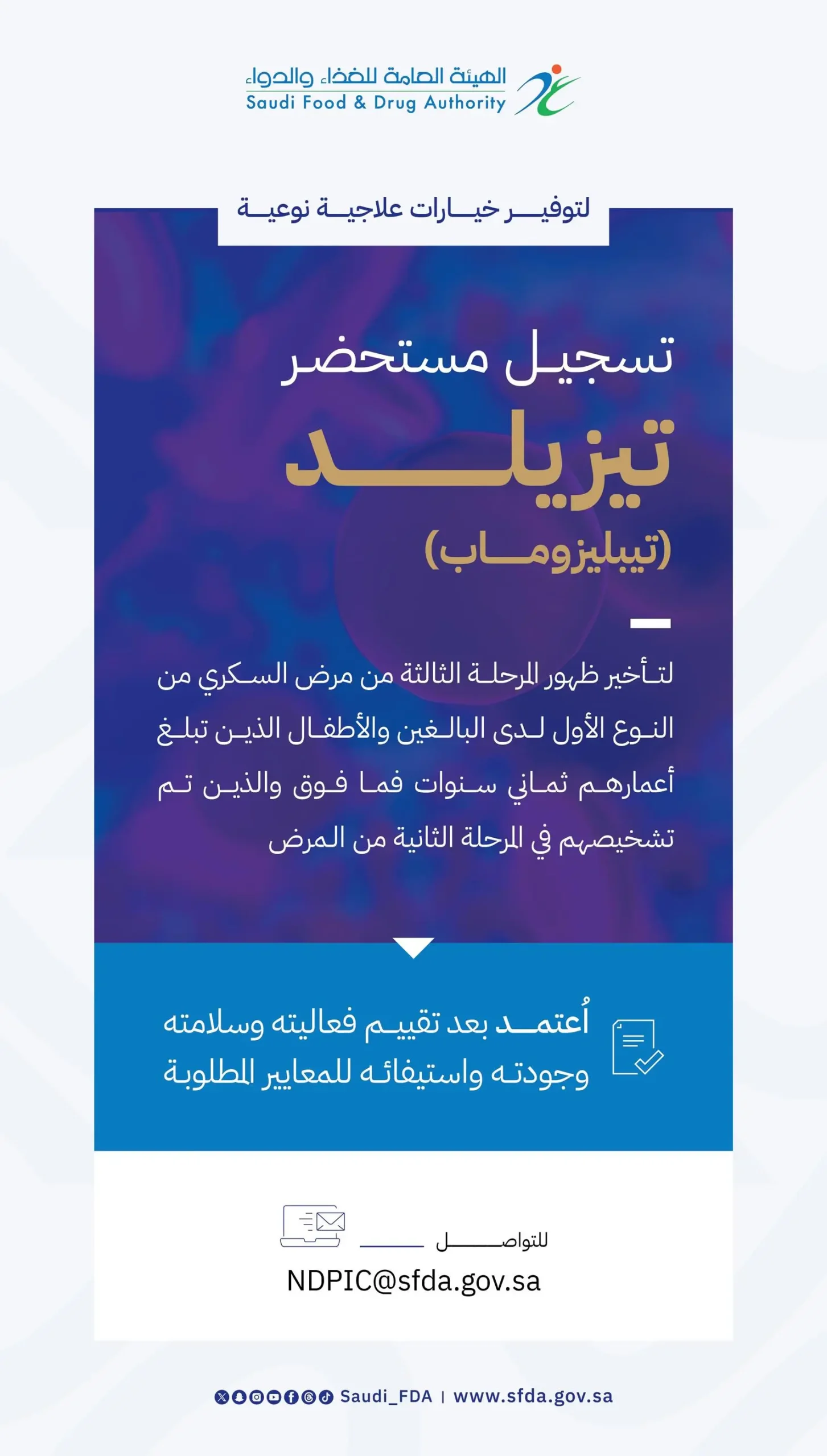 اعتمدت الهيئة العامة للغذاء والدواء تسجيل مستحضر تيزيلد “تيبليزوماب”، إذ يعمل على تأخير ظهور المرحلة الثالثة من مرض السكري من النوع الأول لدى البالغين والأطفال الذين تبلغ أعمارهم ثماني سنوات فما فوق، والذين تم تشخيصهم في المرحلة الثانية من المرض.