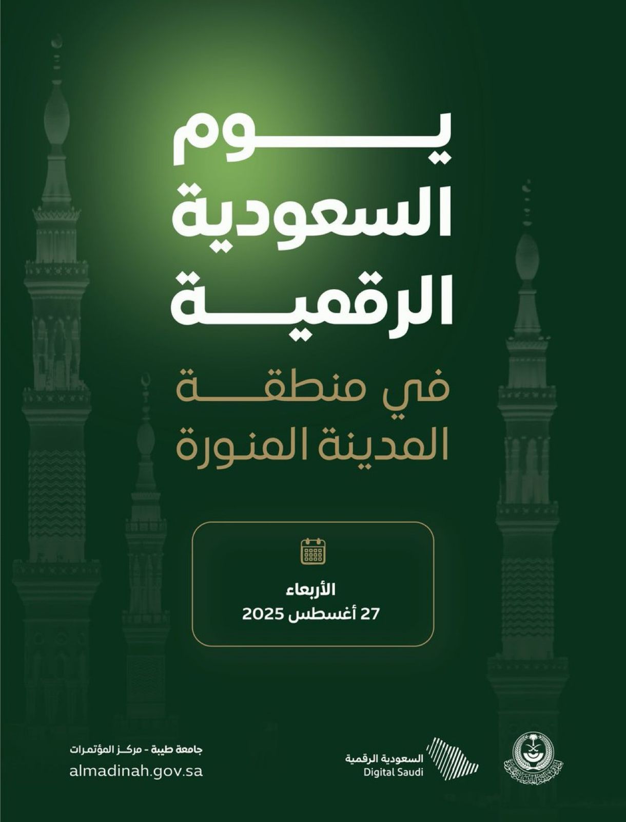 برعاية أمير منطقة المدينة المنورة.. تنطلق فعاليات “يوم السعودية الرقمية” بمشاركة جهات حكومية وخاصة، بهدف تعزيز الوعي بخدمات الحكومة الرقمية، وذلك في إطار مستهدفات