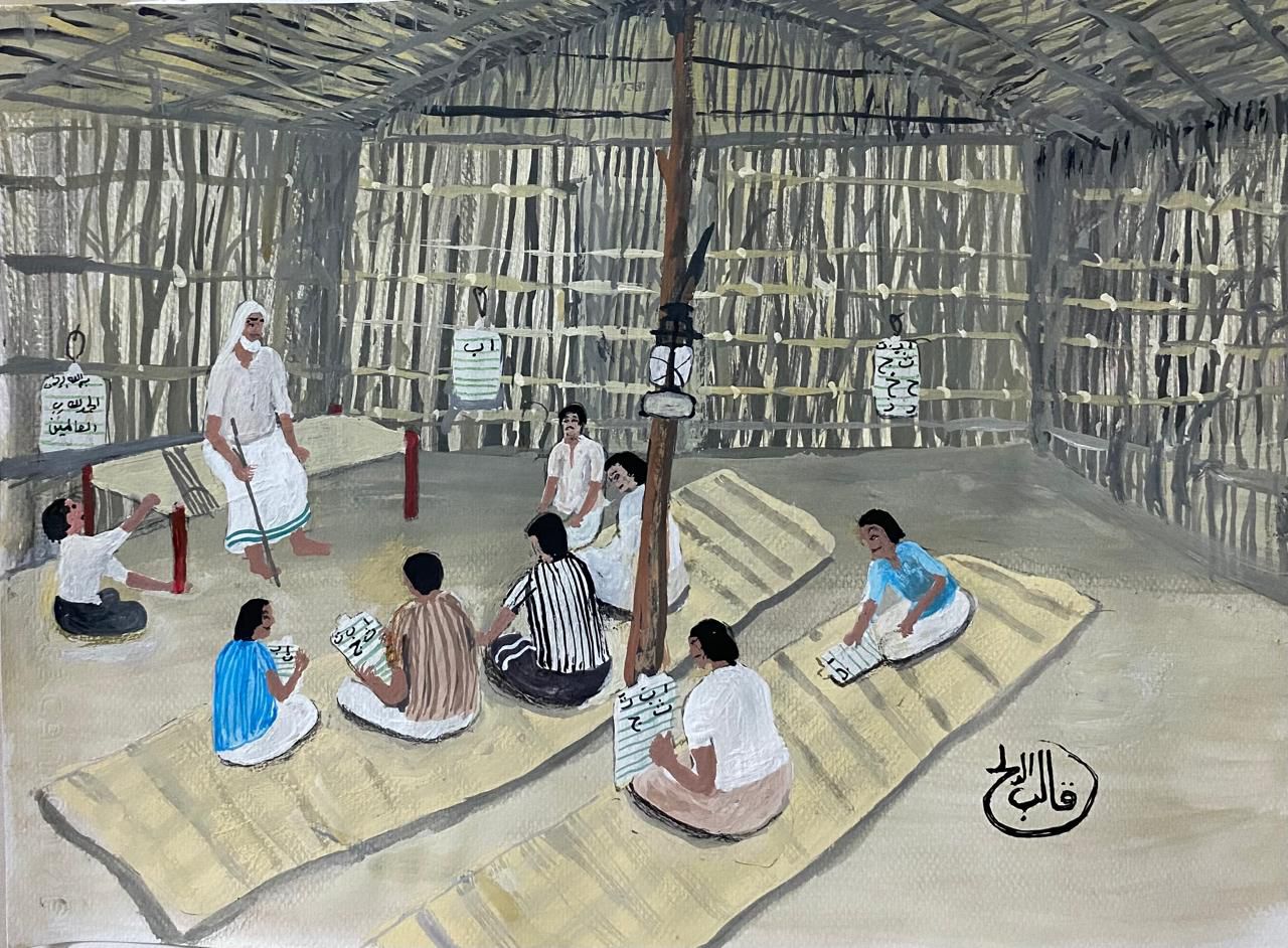 ويحمل كل طالب إلى المدرسة لوحاً من الخشب مستطيل الشكل، له مقبض في أعلاه، ويدهن بورق العشرق حتى يكتسب اللون الأخضر، ثم يخطط وتكتب عليه الحروف الهجائية بخط واضح بقلم يتخذ من القصب (قصب الذرة) بعد أن يجف ثم يُبرى طرفه لتتكون الريشة التي يكتب بها.