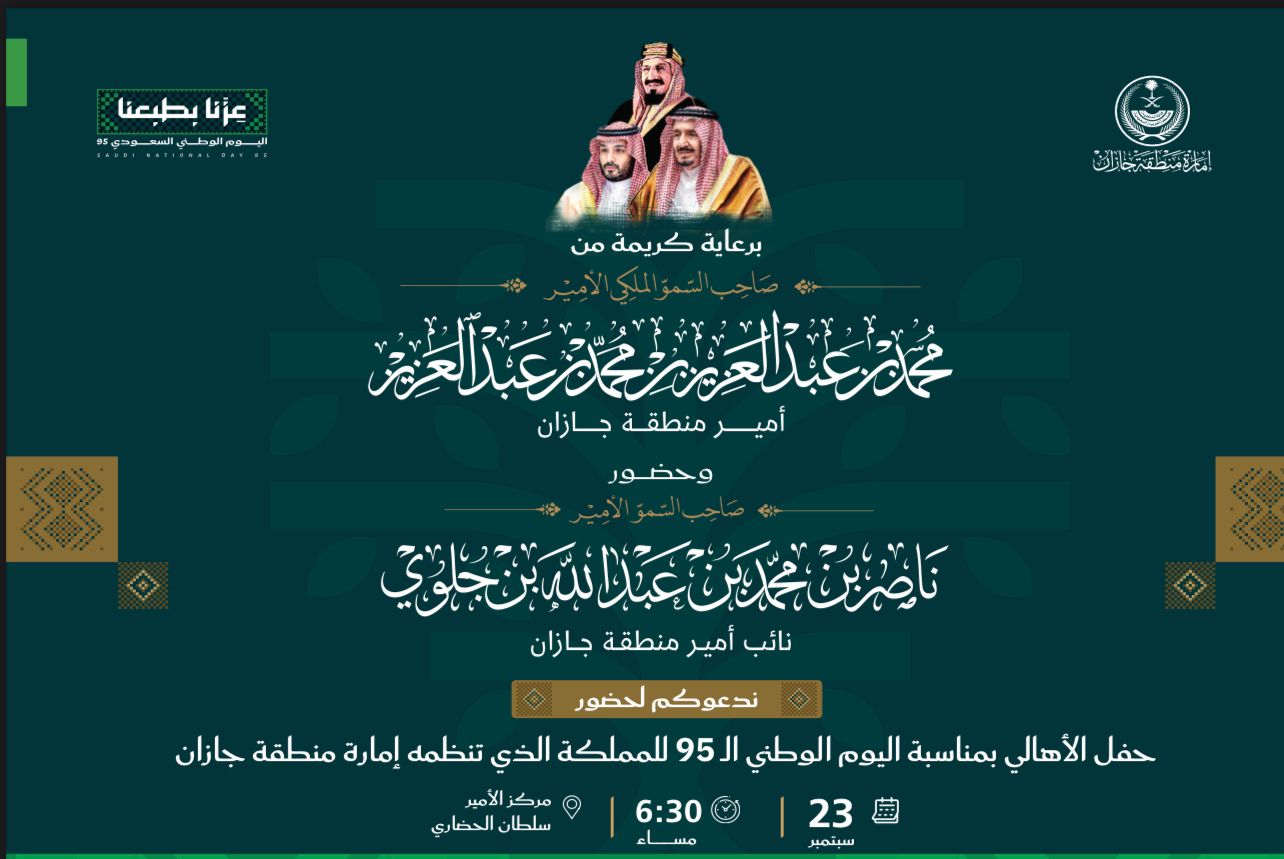 تشهد إمارة منطقة جازان احتفالاً مميزاً بمناسبة اليوم الوطني الـ95 للمملكة العربية السعودية، وذلك تحت رعاية سمو الأمير محمد بن عبد العزيز أمير منطقة جازان ونائبه سمو الأمير ناصر بن محمد.نائب أمير منطقة جازان .