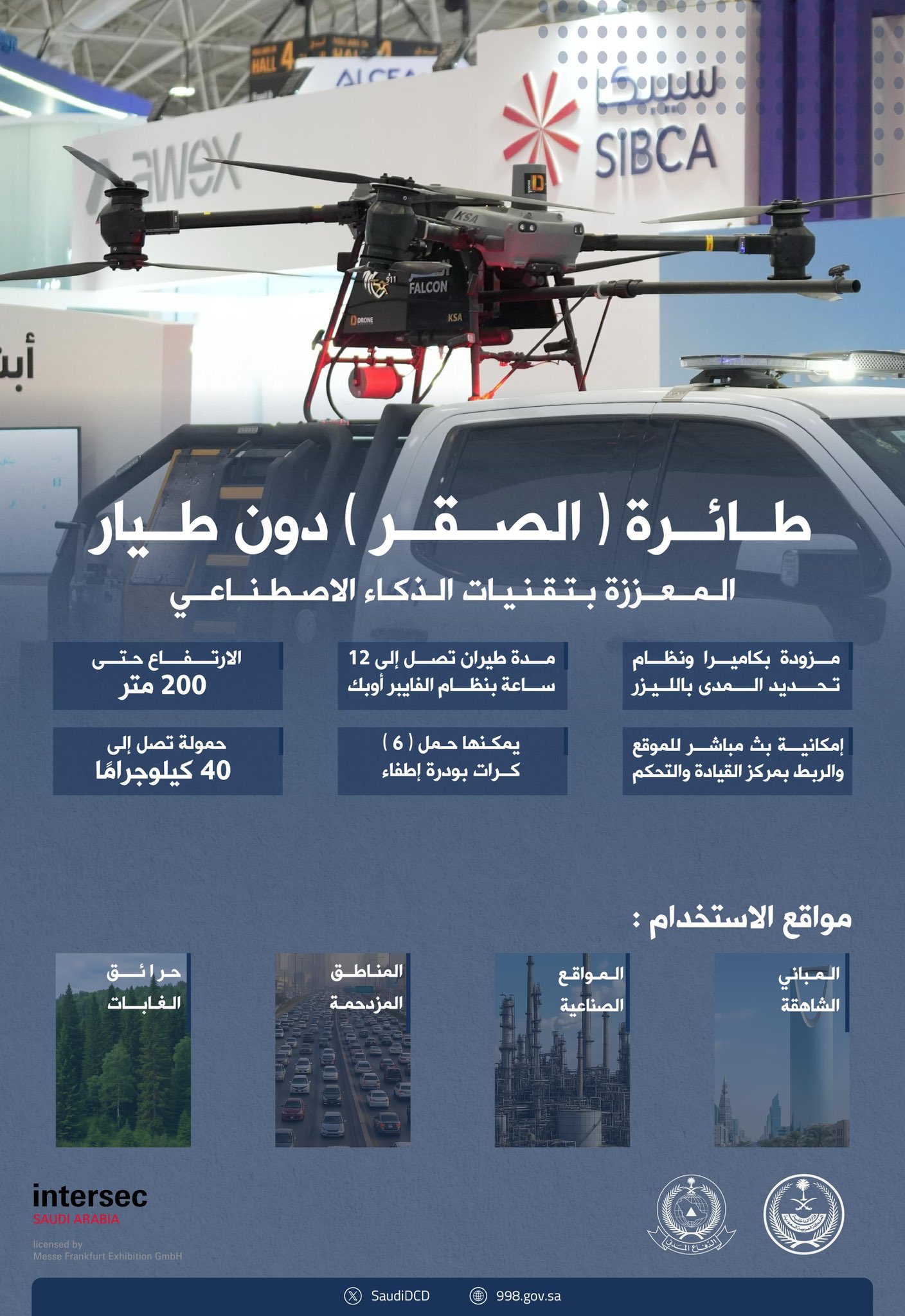 في إطار جهود الدفاع المدني خلال فعاليات معرض إنترسك السعودية 2025، المقام بمركز الرياض الدولي للمؤتمرات والمعارض، استعرض الدفاع المدني طائرة الدرون “الصقر”، التي تُعد من أبرز ابتكاراته لتعزيز سرعة الاستجابة للحوادث باستخدام أحدث التقنيات المتطورة في أعمال الإطفاء والإنقاذ.