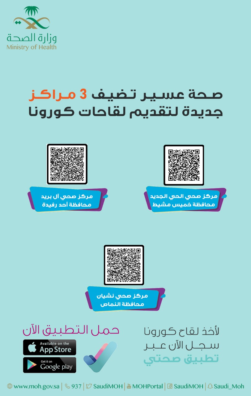 وأوضحت صحة عسير أن مراكز اللقاحات الجديدة مهيأة بالتجهيزات اللازمة، حيث تم تجهيز مركز صحي الحي الجديد بمحافظة خميس مشيط، ومركز صحي آل بريد بمحافظة أحد رفيدة ومركز صحي نشيان بمحافظة النماص، كما تم توفير جميع الخدمات اللازمة فيها، ويدير تلك المراكز نخبة من الكوادر الطبية المتخصصة، وتأتي تلك المراكز إلى جانب المراكز التي تم تدشينها مسبقاً وهي مركز اللقاحات بالمستشفى الميداني بأبها ومركز اللقاحات بمحافظة محايل عسير، مبينة أنه سيتم إضافة عدد من المواقع الجديد الأخرى في المنطقة ويجري العمل على تجهيزها، لتكون مراكز مجهزة لتقديم اللقاح.