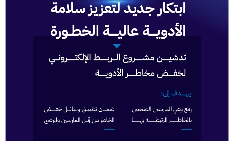 ويهدف المشروع إلى إدراج وسائل خفض المخاطر الإضافية ضمن الأنظمة الإلكترونية لصرف الأدوية في المستشفيات لضمان تطبيقها وتعزيز الاستخدام الآمن للمستحضرات الصيدلانية، إضافةً إلى رفع مستوى وعي الممارسين الصحيين بالمخاطر المرتبطة بالأدوية عالية الخطورة.