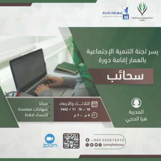 تنظم لجنة التنمية الاجتماعية الأهلية بالعمار ، وبالتعاون مع مركز مسارات رائدة دورة تدريبية بعنوان : سحائب ، مع المدربة الأستاذة هيا الحجي مجانا ،يومي الثلاثاء والاربعاء 18 -19 / 7 / 1442 للنساء فقط . من الساعة 4 م إلى 7 مساء عن طريق برنامج الزووم