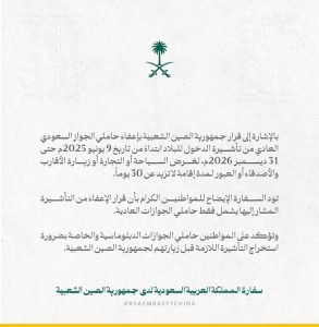 أوضحت سفارة المملكة العربية السعودية لدى جمهورية الصين الشعبية تفاصيل قرار الصين إعفاء حاملي الجواز السعودي العادي من تأشيرة الدخول إلى أراضيها، مبينة أن القرار بدأ من 9 يونيو 2025م ويستمر حتى 31 ديسمبر 2026م.