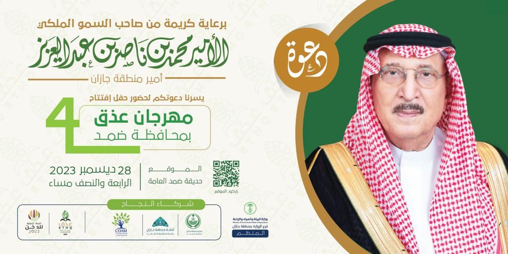 تنطلق فعاليات مهرجان عذق الرابع الذي ينظمه فرع وزارة البيئة والمياه والزراعه بمنطقة جازان يوم الخميس 28 ديسمبر 2023 بمحافظة ضمد بمنطقة جازان ، ويهدف هذا الحدث لدعم المزارعين لتسويق منتجاتهم من المحاصيل الحقلية ومن أهمها الذرة الرفيعة والسمسم والدخن والصناعات التحويلية ..