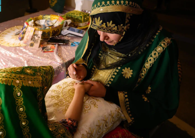 إيمان القادمة من القطيف، تحمل معها قوة ثلاثين عامًا من الذاكرة, تقول إن بدايتها تعود إلى لحظات طفولتها الأولى، حين كانت ترى أمها ترسم الحناء في الأعياد والمناسبات, لكن ما كان يحدث داخل المجالس قبل ثلاثة عقود لم يعد هو نفسه اليوم، ترسم إيمان بخفة وهي تتحدث وتقول: إن شكل الحناء اختلف كثيرًا، ولم يعد مجرد أشكال تقليدية محفوظة، بل صار مساحة واسعة للفن، للتجريب، ولإدخال عناصر جديدة لا تبتعد عن التراث لكنها تفتح له أبوابًا أخرى.