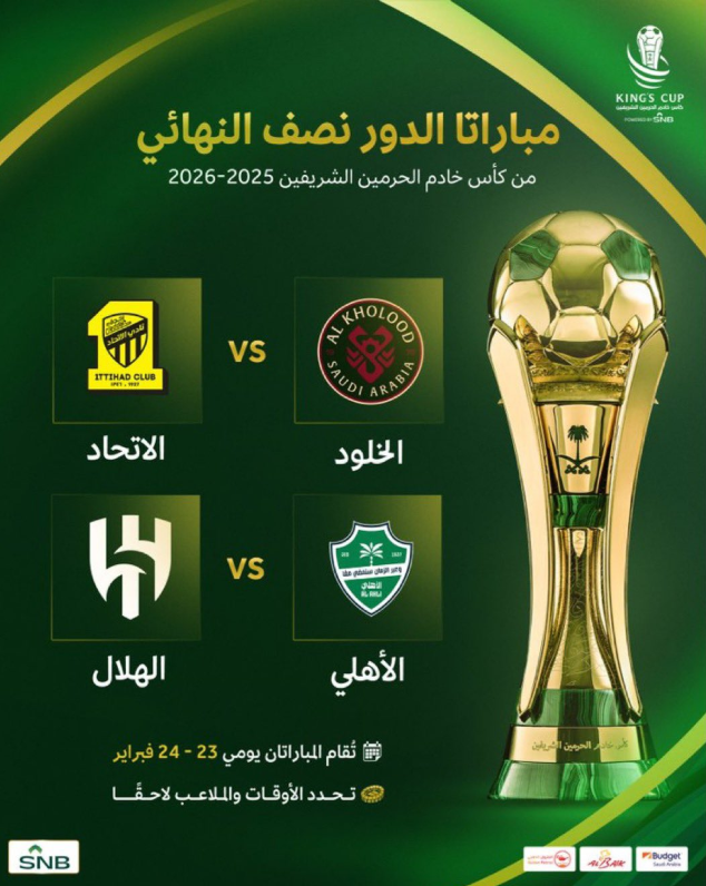 الخلود يواجه الاتحاد، والأهلي يلتقي الهلال في نصف نهائي كأس خادم الحرمين الشريفين لكرة القدم.