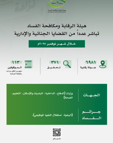 باشرت هيئة الرقابة ومكافحة الفساد «نزاهة» عددًا من القضايا الجنائية والإدارية إذ نفذت 6981 جولة رقابية خلال شهر نوفمبر 2025.