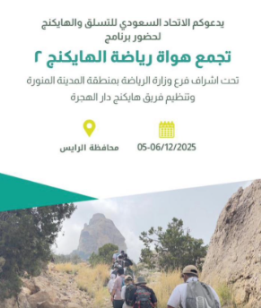 تستعد محافظة الرايس خلال يومي 5–6 ديسمبر 2025 لاحتضان أحد أبرز التجمعات الرياضية المنتظرة في المنطقة، حيث ينطلق تجمع هواة رياضة الهايكنج 2 بتنظيم فريق هايكنج دار الهجرة، وتحت إشراف فرع وزارة الرياضة بمنطقة المدينة المنوّرة، وبدعم من الاتحاد السعودي للتسلق والهايكنج والمركز الوطني لتنمية الغطاء النباتي ومكافحة التصحر.