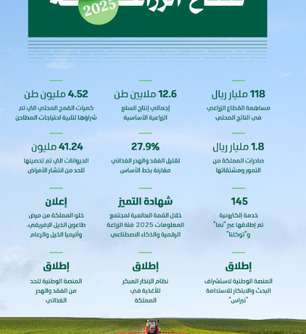 وحقق القطاع الزراعي تقدمًا ملموسًا في تعزيز الإنتاج والاستدامة، حيث بلغ إجمالي إنتاج السلع الزراعية الأساسية خلال عام 2024م نحو 12.6 ملايين طن، من (القمح، الخضار، الفواكه، التمور، الأسماك، الحليب الطازج، اللحوم الحمراء، الدواجن، البيض، والعسل)، مما ساهم في ارتفاع الناتج المحلي للقطاع الزراعي إلى 118 مليار ريال، محققًا نسبة نمو بلغت 5% عن العام السابق، كما ساهمت هذه الإنجازات خفض العجز في الميزان التجاري للأغذية والزراعة بنسبة 3% ليصل إلى 84 مليار ريال مقارنة بـ 86 مليار عن العام 2023م، وذلك رغم تسجيل نموًا سكانيًا بلغ 4.7% خلال العام نفسه، وتعكس هذه النتائج التزام المملكة لتطوير القطاع الزراعي ورفع كفاءة الإنتاج وتعزيز الابتكار، بما يحقق أهداف الأمن الغذائي والتنمية المستدامة على مستوى المملكة.