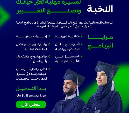 «التأمينات» تعلن فتح باب التسجيل في النسخة العاشرة من برنامج «النخبة» المنتهي بالتوظيف