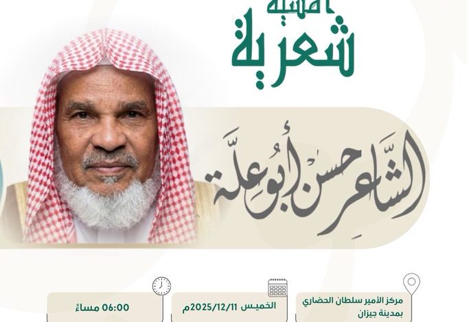 بحضور صاحب السمو الملكي الأمير محمد بن عبدالعزيز بن محمد بن عبدالعزيز أمير منطقة جازان وسمو نائبه الأمير ناصر بن محمد بن عبدالله بن جلوي تقيم جمعية أدبي جازان أمسية للشاعر الكبير حسن أبو علة على مسرح مركز الأمير سلطان الحضاري بجازان مساء اليوم الخميس الـ ١١ من ديسمبر ٢٠٢٥م .