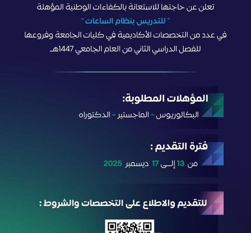 أعلنت جامعة طيبة بالمدينة المنورة اليوم إتاحة فرص تعاون للكفاءات الوطنية المؤهلة من حملة البكالوريوس والماجستير والدكتوراه للتدريس بنظام الساعات في عدد من كلياتها وفروعها خلال الفصل الدراسي الثاني من العام الجامعي 1447 هـ.
