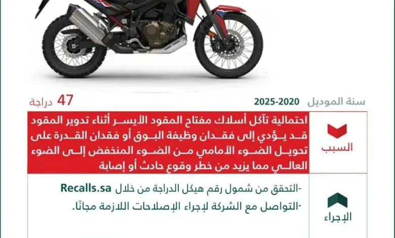 ودعت مستخدمي الدراجة النارية إلى التحقق من شمول رقم هيكل الدراجة من خلال (http://Recalls.sa)، والتواصل مع شركة عبدالله هاشم المحدودة على الرقم المجاني (8001199988) لإجراء الإصلاحات اللازمة مجانًا.