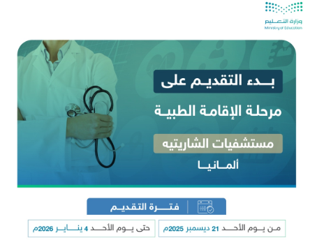 أعلنت وزارة التعليم بدء التقديم على مقاعد الابتعاث لمرحلة الإقامة الطبية في مستشفيات الشاريتيه بألمانيا، وذلك ضمن مسار الاتفاقيات الصحية.