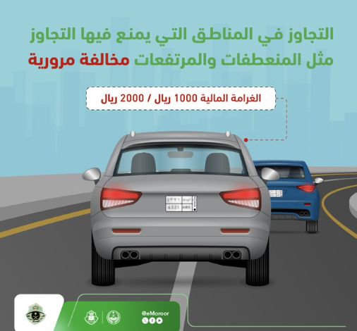 أوضحت الإدارة العامة للمرور، غرامة التجاوز في الأماكن التي يمنع فيها التجاوز مثل المنعطفات والمرتفعات.
