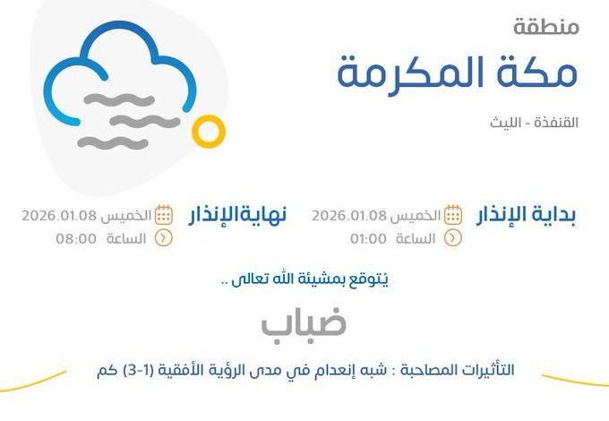 وأضاف المركز، عبر منصة (إكس)، أن منطقة الباحة «الباحة، القرى، المندق، بلجرشي، بني حسن»، تشهد ضبابا يؤثر على مدى الرؤية الأفقية.