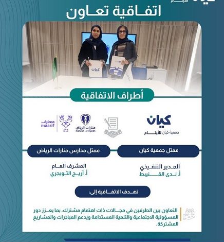 وتهدف الاتفاقية إلى تعزيز وتمكين أبناء الجمعية من خلال إطلاق مبادرات تعليمية وإعلامية مشتركة، وتفعيل العمل التطوعي، وإتاحة فرص تطوع منظمة لطلاب وطالبات مدارس منارات الرياض العالمية بما يتوافق مع برامج جمعية كيان، إضافة إلى إبراز جهود الجمعية عبر محتوى إعلامي متخصص يسهم في رفع الوعي المجتمعي بقضايا الأيتام.