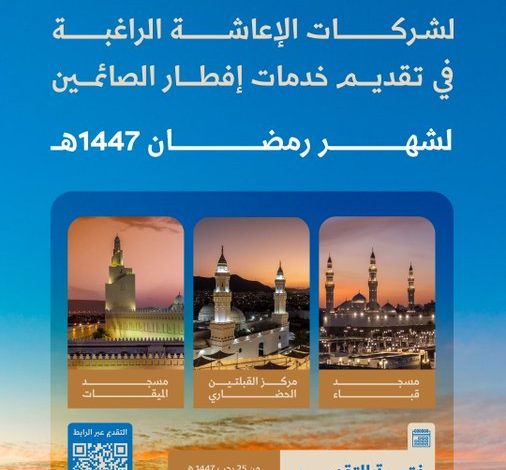 أعلنت هيئة تطوير المدينة المنورة بدء استقبال طلبات شركات الإعاشة لخدمة تقديم وجبات “إفطار صائم” خلال شهر رمضان المبارك في عددٍ من المساجد التاريخية.