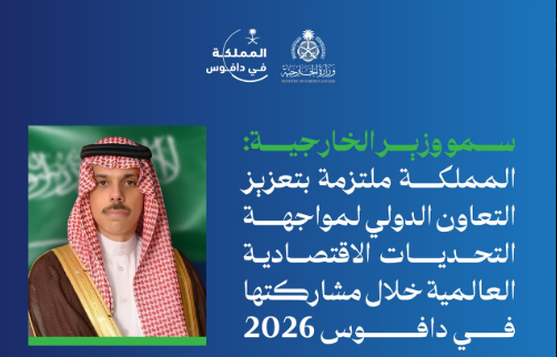 أكد صاحب السمو الأمير فيصل بن فرحان بن عبدالله وزير الخارجية، أن المملكة تُظهر من خلال مشاركتها في أعمال المنتدى الاقتصادي العالمي في دافوس 2026 تحت شعار “قيم الحوار”، التزامها العميق بتعزيز التعاون الدولي لمواجهة التحديات الاقتصادية العالمية، مع التأكيد لضرورة الحفاظ على السلام والاستقرار الإقليمي، إلى جانب دعم التنمية المستدامة وتعزيز الشراكات الاقتصادية العالمية.