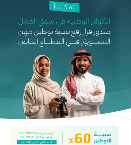 ويقضي القرار الأول رفع نسبة التوطين إلى 60٪ في مهن التسويق بالقطاع الخاص اعتبارًا من 19/01/2026م، ويُطبّق على المنشآت التي يعمل بها 3 عاملين فأكثر في مهن التسويق، مع تحديد الحد الأدنى للأجور بــ 5,500 ريال، وتشمل المهن المستهدفة: (مدير تسويق، وكيل دعاية وإعلان، مدير دعاية وإعلان، مصمم جرافيك، مصمم إعلان، أخصائي علاقات عامة، أخصائي دعاية وإعلان، أخصائي تسويق، مدير علاقات عامة، مصور فوتوغرافي)، ويبدأ تطبيق القرار بعد 3 أشهر من تاريخ الإعلان؛ بهدف إتاحة الفترة اللازمة للمنشآت للاستعداد وتطبيق القرار.