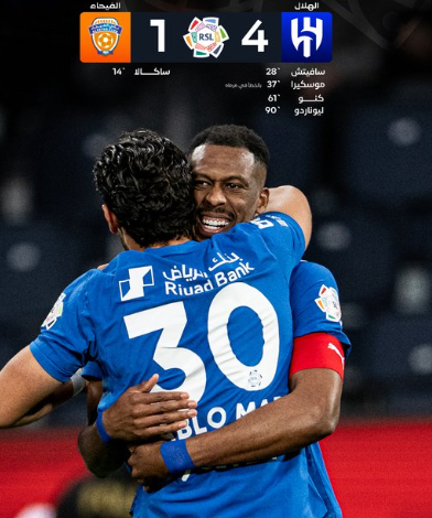 حقق فريق الهلال الفوز على الفيحاء بنتيجة (4 – 1) في المباراة التي أقيمت مساء أمس على ملعب “المملكة أرينا” في الرياض، ضمن منافسات الجولة السابعة عشرة من الدوري السعودي للمحترفين “دوري روشن”.