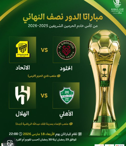 قررت إدارة المسابقات في الاتحاد السعودي لكرة القدم تأخير مباراتي الدور نصف النهائي من كأس خادم الحرمين الشريفين بين فريقي الخلود والاتحاد، والأهلي والهلال إلى يوم الأربعاء 18 مارس 2026 الموافق 29 رمضان ـ حسب تقويم أم القرى ـ لتقام المباراتين في نفس التوقيت الساعة العاشرة مساءً.