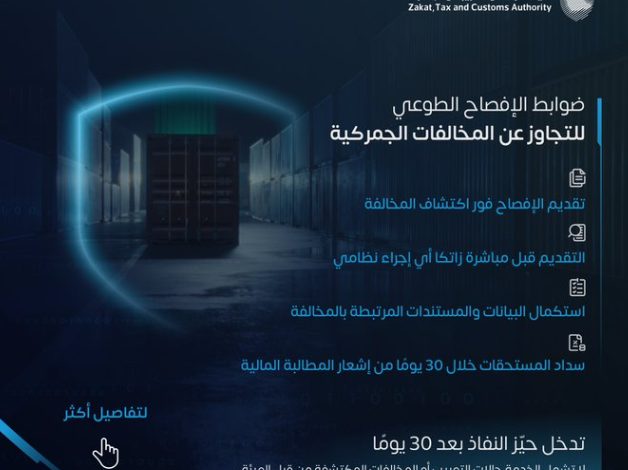 كما ألزمت الضوابط المكلف بسداد كامل الرسوم الجمركية والفروقات المالية الناتجة عن المخالفات محل الإفصاح خلال مدة لا تتجاوز 30 يوماً من تاريخ إشعار الهيئة بالمطالبة المالية، على أن يقتصر التجاوز على الغرامات فقط دون الرسوم المستحقة.