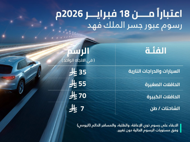 أعلنت المؤسسة العامة لـ جسر الملك فهد تطبيق رسوم جديدة لعبور المركبات في الاتجاه الواحد، اعتبارًا من 18 فبراير 2026، ضمن تحديثات تنظيمية لحركة التنقل عبر الجسر.