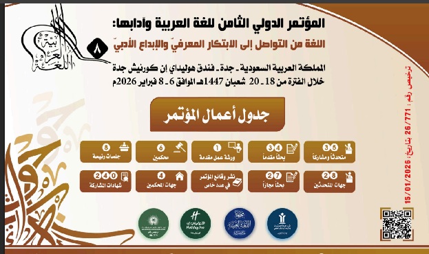 تستضيف جدة المؤتمر الدولي الثامن للغة العربية وآدابها، تحت عنوان «اللغة من التواصل إلى الابتكار المعرفي والإبداع الأدبي»، وذلك خلال الفترة من 18 إلى 20 شعبان 1447هـ، الموافق 6 إلى 8 فبراير 2026م، في فندق هوليداي إن كورنيش جدة.
