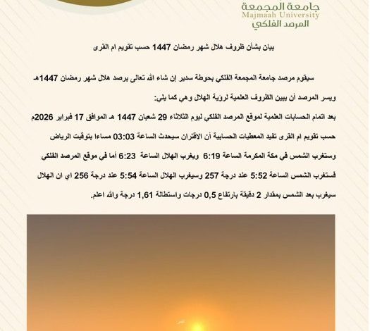 كشف مرصد جامعة المجمعة الفلكي بحوطة سدير عن الظروف العلمية لرصد هلال شهر رمضان المبارك لعام 1447هـ، مبيناً أن الحسابات الفلكية لموقع المرصد تفيد بأن الاقتران المركزي سيحدث يوم الثلاثاء 29 شعبان 1447هـ، الموافق 17 فبراير 2026م، عند الساعة 03:03 مساءً بتوقيت الرياض.